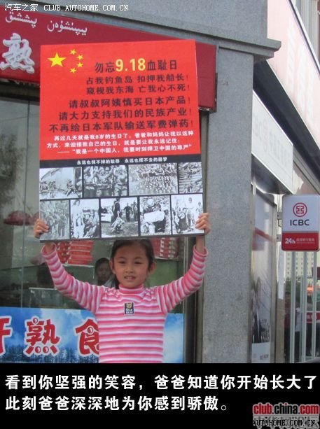 (转) 首先,我也从没有给孩子灌输什么革命大道理,我只想让她知道我们是中国人。在女儿举的那个牌子上,我也清楚地写明“请慎买日本产品”。“慎买”和“拒买”,一字之差,要看个人的选择态度了。女儿曾经问我:“只要是日本产品都不要买吗?”,我说不是,在产品同等的功能下,请优先购买中国产品。因为在某些领域,日本的科技暂时领先于我们,漠视这个现实,什么都一棍子打死,那是不明智的。但过于迷信日本,什么东西都买日本的,那就不对了。