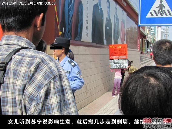 大概15分钟后,商场的一个女保安上前,试图将我女儿引到石油新村那面,但随即被几个围观的男子指责。不一会,苏宁的一名女工作人员上前,看了看牌子皱了下眉头,指挥两个保安将我女儿驱赶开。女儿后撤几步,继续举起牌子。那一刻,我一直揪着心看着,我担心女儿会被吓住,然后放下牌子哭着找我。但她没有,她死死抱着牌子,和保安一直对立僵持着。这时候,有几个比我女儿大的女孩,急忙上前护着我的女儿。