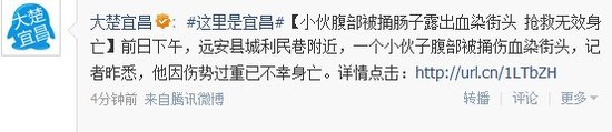 小伙腹部被捅肠子露出血染街头 抢救无效身亡