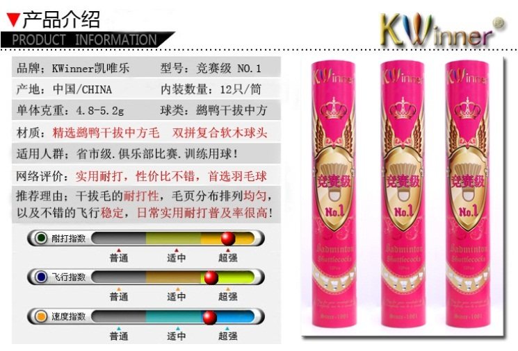 本品采用干拔中方羽毛和进口软木球头制作,毛片、球头、飞行、稳定性、耐打度、手感等品质均超越亚狮龙6号,是凯唯乐品牌旗下的经典产品,100%好评!