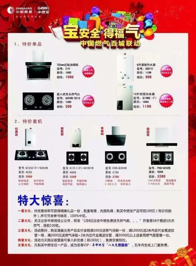 【二】你买我送:活动时间:1月8日-1月9日。活动期间,实付金额满500元送燃气保险一份,满1000元送2米内定尺金属波纹管一根,满2000元送燃气保险+2米内定尺金属波纹管,满3000元以上送家用燃气报警器一台。