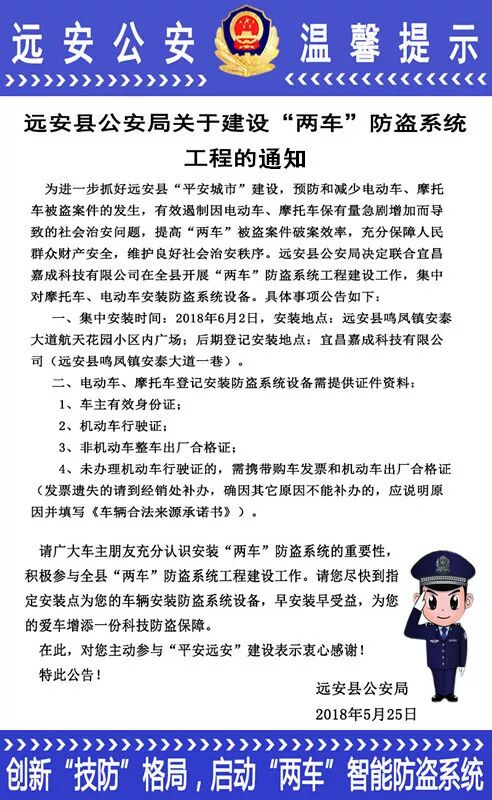 【提醒】远安人注意!警察蜀黍喊你来装车辆防盗装置,车丢了有人赔!